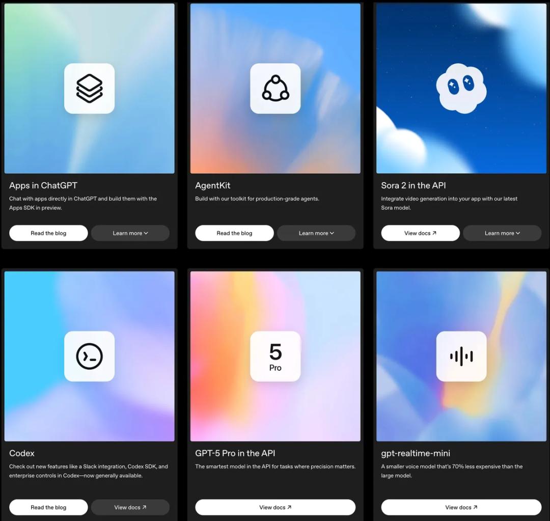 而最底層的基座,是那幾款重磅模型:GPT-5 Pro API、gpt-realtime-mini 語音模型、Sora 2 影片模型。