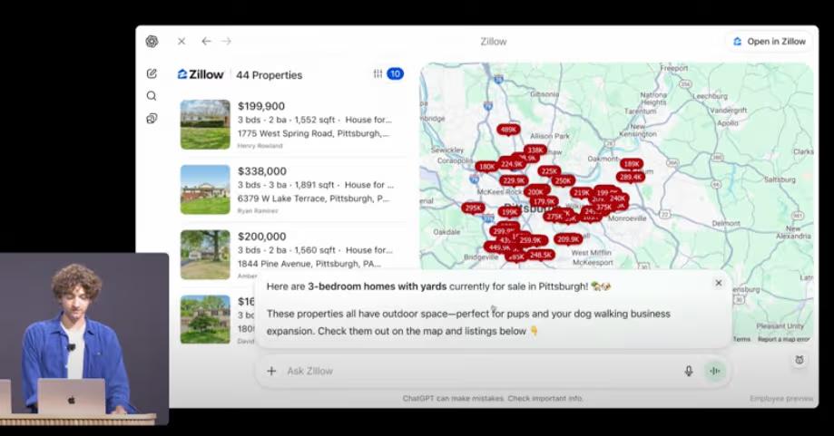 想找紐約帶庭院的房子?只需一句話,它就調出 Zillow 模塊,地圖、價格、戶型信息一目瞭然。整個體驗不需要跳轉、不割裂,就像這些應用本身就是 ChatGPT 的一部分。