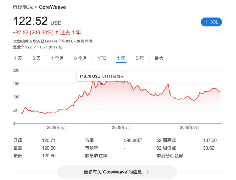 2025年最引人注目的科技股之一,一定是今年上市的CoreWeave。2025年由英偉達支持的CoreWeave上市,自IPO以來,其股價已上漲兩倍多,最高漲幅接近4倍。