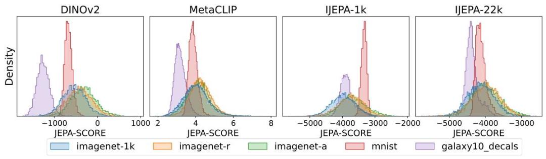 面對未參與預訓練的星系圖像數據集,其JEPA-SCORE顯著低於ImageNet數據,說明模型能精準識別陌生數據;