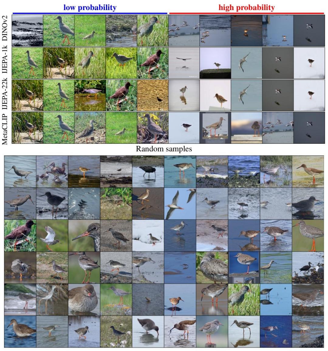 在ImageNet數據集中,不同JEPAs模型對典型樣本(如飛行姿態的鳥類)和罕見樣本(如棲息姿態的鳥類)的JEPA-SCORE判定高度重合,證明這是JEPAs的共性能力,並不是某個模型的偶然;