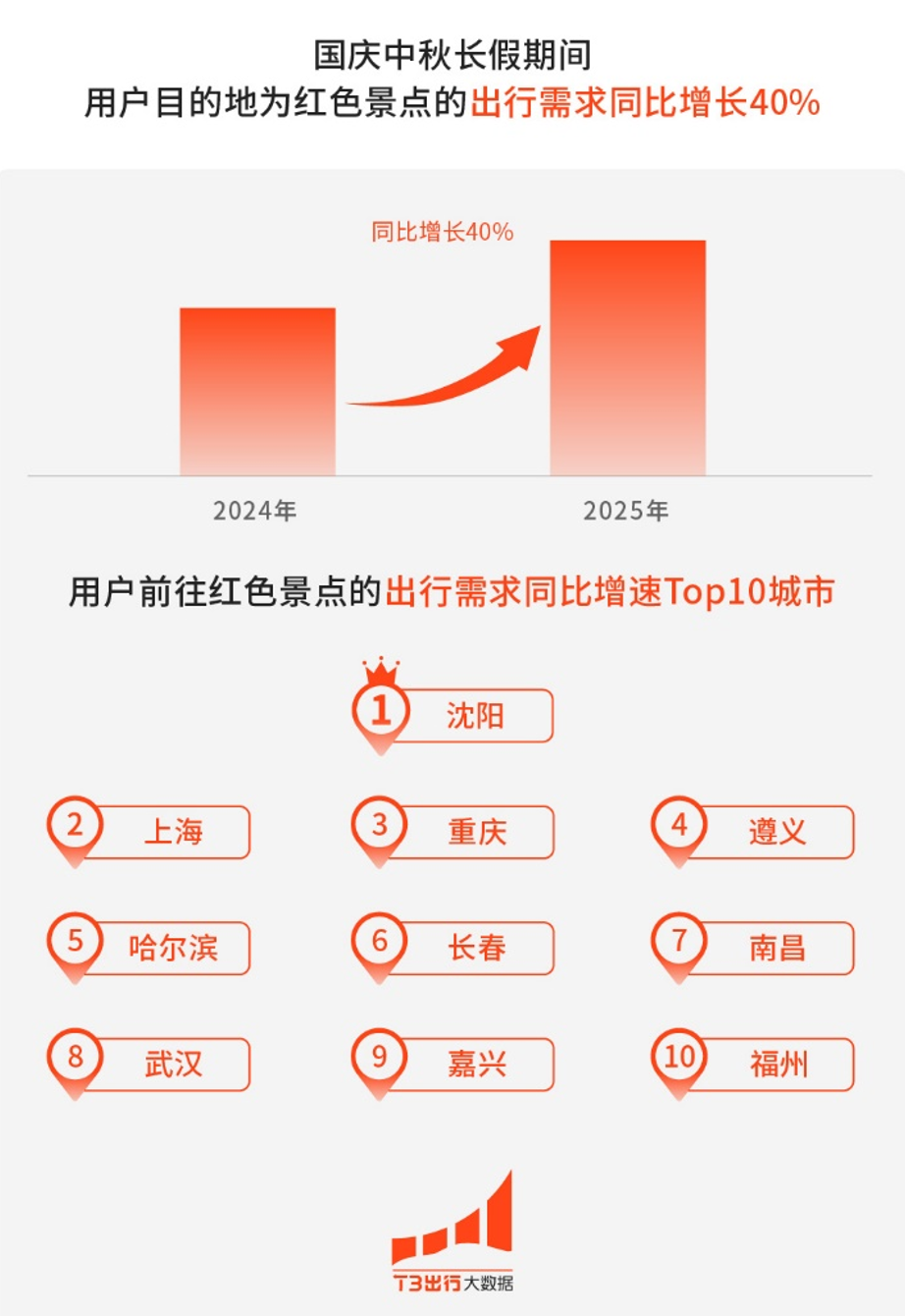 “紅色遊”是今年長假的又一亮點。據T3出行數據,今年國慶中秋長假期間,用戶目的地為紅色景點的出行需求同比增長40%。紅色旅遊目的地出行需求同比增速TOP10城市分別為:瀋陽、上海、重慶、遵義、哈爾濱、長春、南昌、武漢、嘉興、福州。其中,上海、哈爾濱、長春、南昌、嘉興是連續兩年入榜紅色旅遊出行需求增速TOP10榜單的城市。