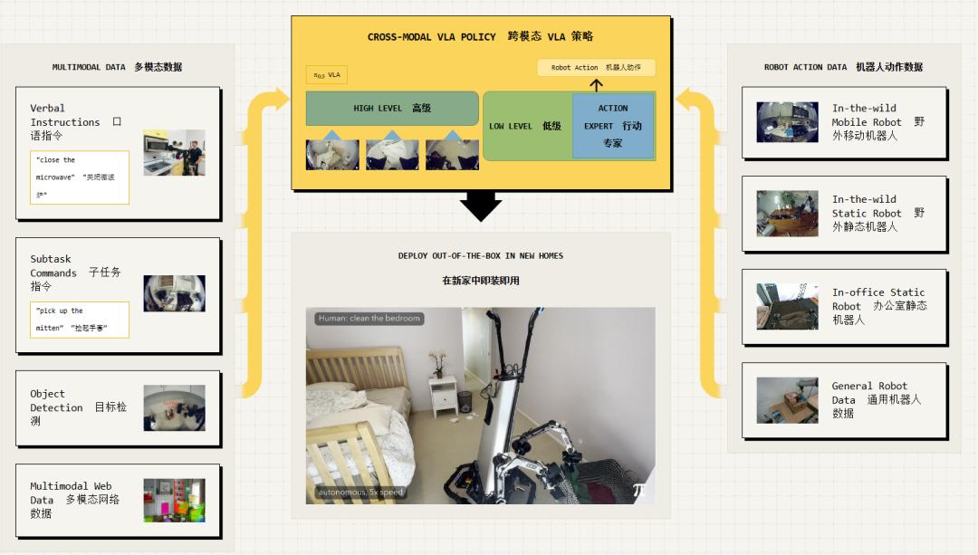 與此同時,Physical Intelligence的π0.5模型已經在未見過的家居環境中,讓機器人完成「清理廚房或臥室」這樣複雜且延展性的家務。