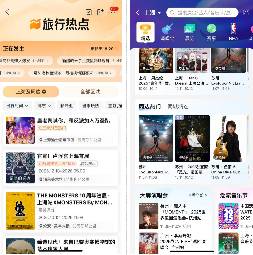 據悉,攜程熱點頻道每月更新5000+旅行熱點,覆蓋全球100多個目的地:“故宮的桂花開滿了”“俄羅斯對中國免簽”“迪士尼萬聖派對開啟”等新熱資訊,都可以在熱點頻道找到。除此以外,去雪梨跑馬拉松、去蘇州看伍佰演唱會等賽事展演活動已經成為旅行原動力,演出/展覽頻道每年上新全球10萬場演唱會、音樂節、賽事、展覽、演出信息,已成為旅行源動力。
