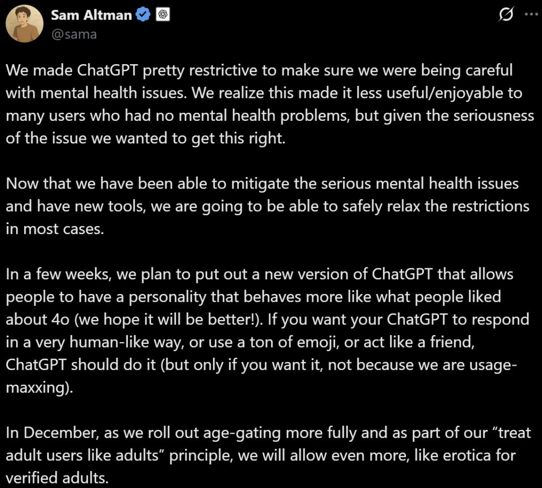 Altman 則強調,更新建立在新的安全工具與審查體系之上,旨在「更負責任地放寬限制」,而非單純追求互動熱度。