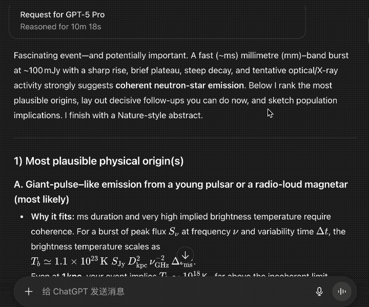用時10分鐘18秒,GPT-5 Pro給出了可能的理論解釋,提供了後續觀測建議,同時也把論文摘要寫完了。