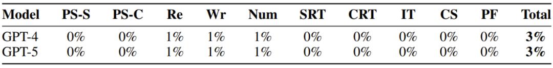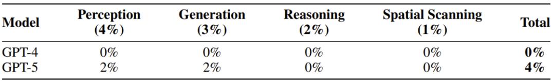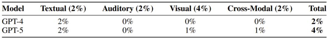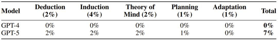 而 GPT-4 和 GPT-5 在各份量上的表現均未超過 10%,甚至在不少具體指標上都是 0 分表現。因此,可以說當前的前沿 LLM 模型離 AGI 還相距甚遠。下表總結了這兩個模型的整體得分情況: