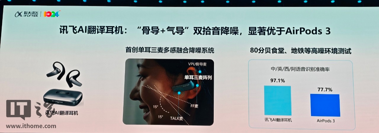 訊飛 AI 翻譯耳機採用「骨導 + 氣導」雙拾音降噪,宣稱顯著優於 AirPods 3,在地鐵、展會等複雜噪聲環境下識別準確率可達 97.1%;