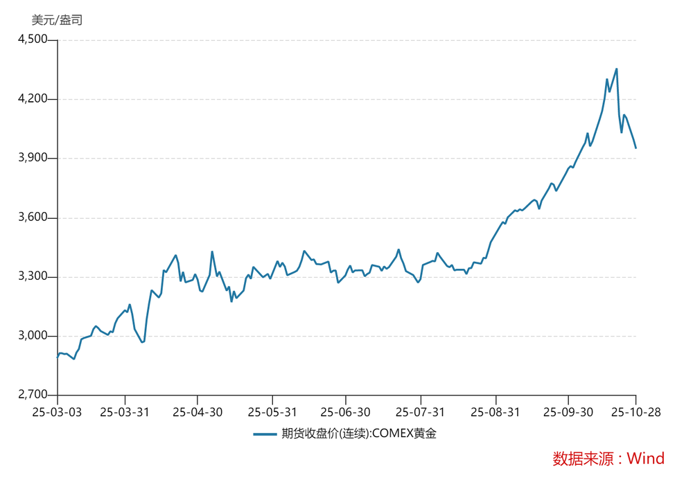 今年黃金漲勢淩厲,僅用了七個月,國際金價便從3000美元/盎司飆至4000美元/盎司。10月20日,COMEX黃金刷出4398美元/盎司的歷史峰值後,次日晚間即重挫5.07%,創上市以來單日最大跌幅;隨後頹勢延續,至10月29日已跌破4000美元/盎司關口,8個交易日內回撤近10%。