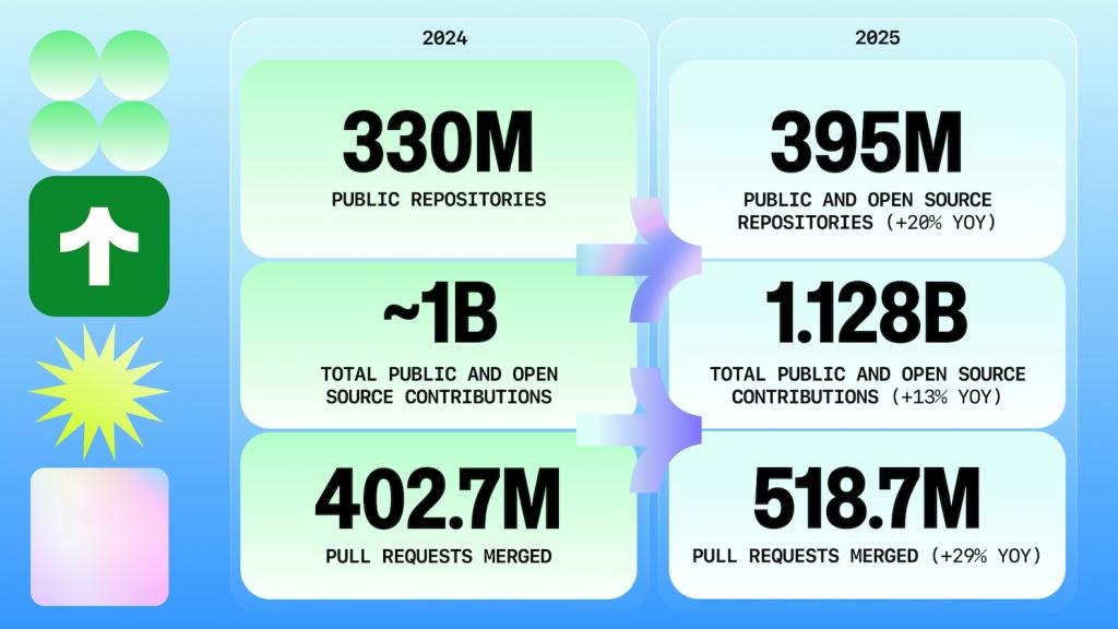 今年,開源開發活動達到了創紀錄的水平,公共倉庫的貢獻總量達到了 11.2 億次(同比增長 13%)。2025 年 3 月是 GitHub 歷史上新增開源貢獻者數量最多的一個月。