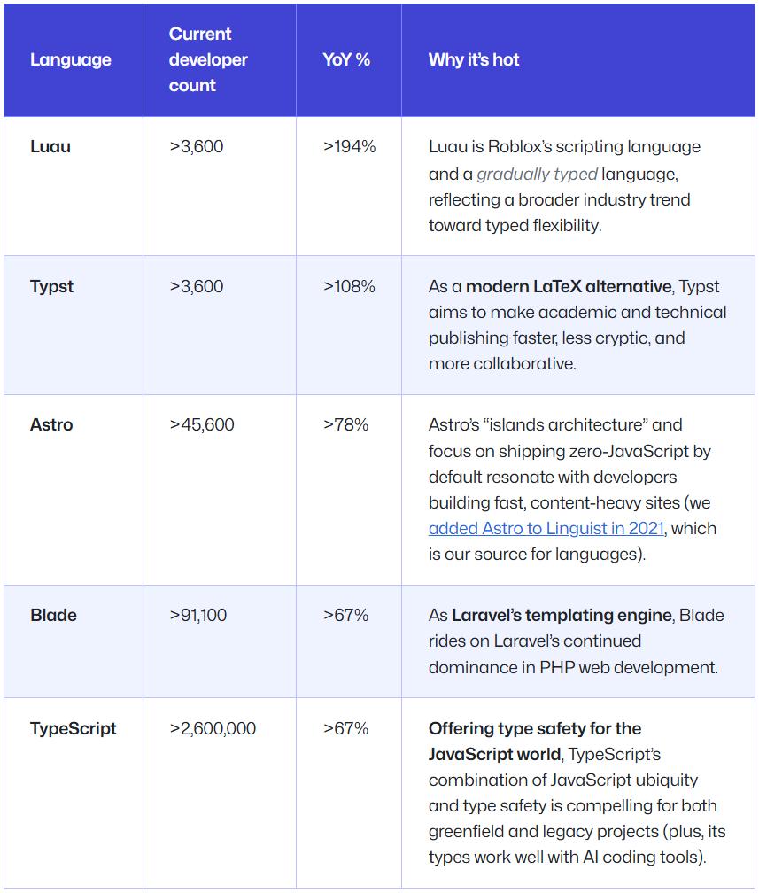 增長最快的語言是 Luau。Luau 是 Roblox 的腳本語言,也是一個逐步類型化的語言,體現了整個行業向「類型靈活性」發展的趨勢。