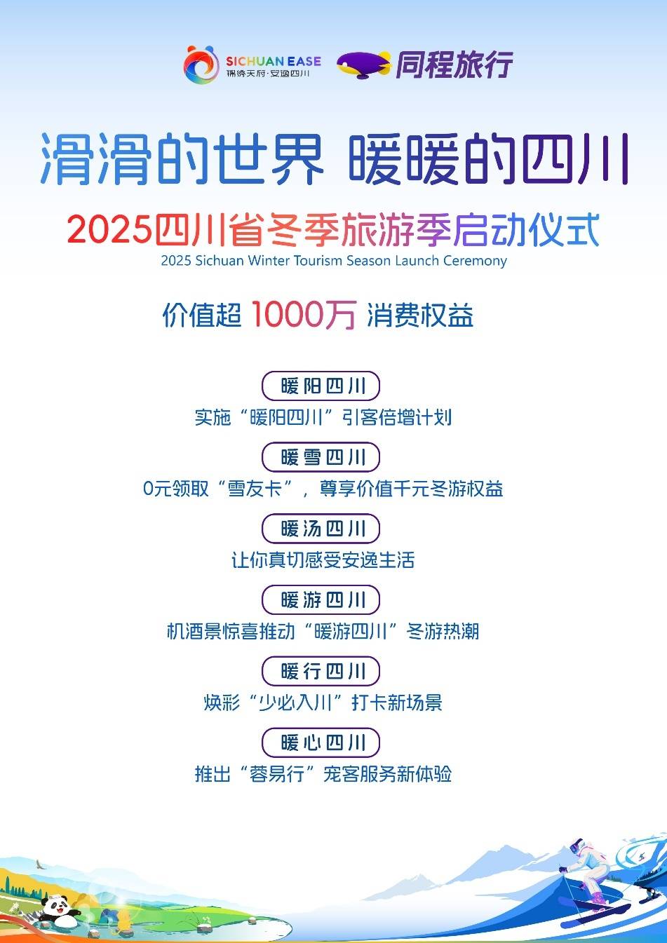 12月8日上午,2025四川省冬季旅遊季啟動儀式在阿壩州汶川縣羌人穀滑雪場隆重舉行。作為本屆四川冬季旅遊季活動的主要合作平台之一,同程旅行在啟動儀式現場發佈了“滑滑的世界·暖暖的四川”主題營銷活動方案,宣佈將投放價值超過1000萬的消費權益支援四川冬季旅遊促消費。
