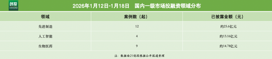 21創投不完全統計,2026年1月12日—1月18日,報告日期內國內一級市場發生融資事件27起。其中,有20筆融資披露了融資金額和幣種信息,總規模約合人民幣52.21億元。