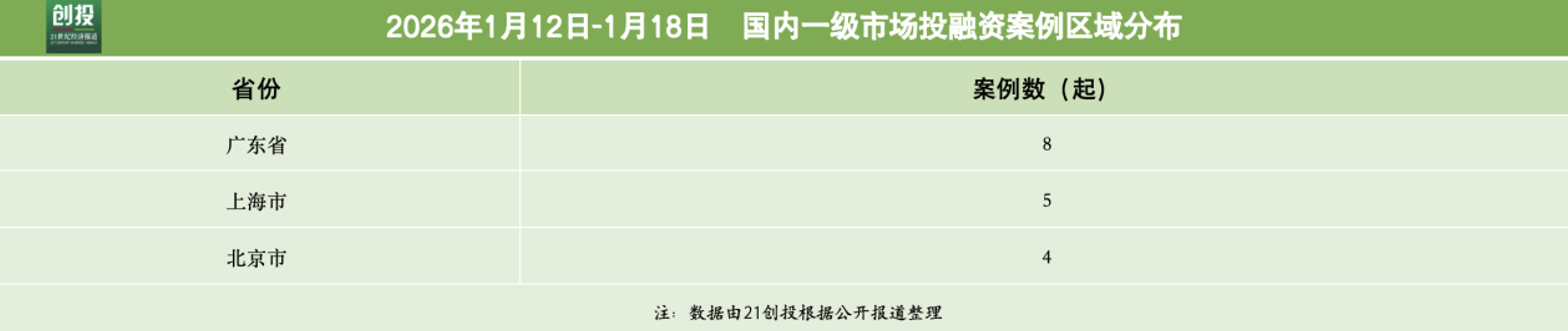 從披露獲投企業的地域分佈來看,本週的融資地區主要集中在上海市、北京市、廣東省,分別完成5筆、4筆、8筆融資。