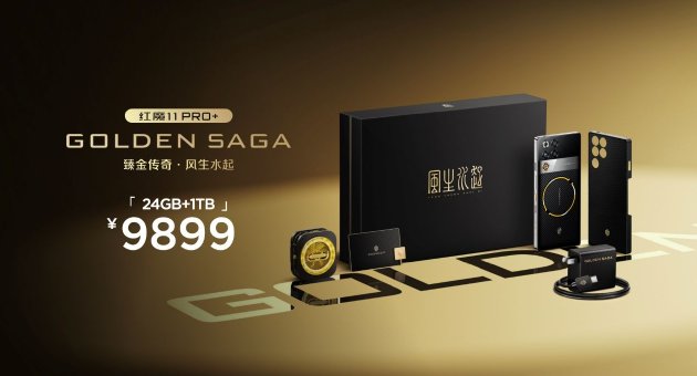 紅魔 11 Pro+ 臻金傳奇搭載行業獨有的24GB+1TB的頂配存儲組合,內部配備凱夫拉磁吸保護殼、專屬磁吸散熱器與臻金卡針、120W魔閃快充等一整套臻金體驗,售價為:9899元;