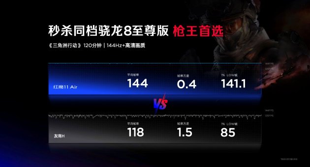 在發佈會上,紅魔官方也展示了紅魔11 Air的遊戲實測水平。在144Hz高清畫質下運行120分鐘《三角洲行動》,紅魔11 Air平均幀率為144幀,1%LOW幀為141.1幀,對比機型平均幀率為118幀,1%LOW幀為85幀。