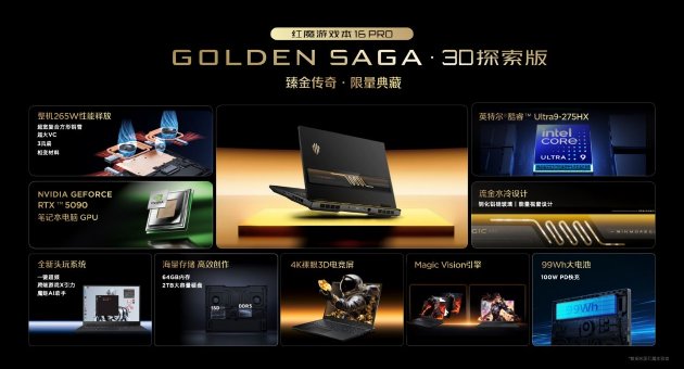 在遊戲本上,紅魔遊戲本16 Pro全新升級GOLDEN SAGA·3D探索版,搭載英偉達5090顯卡,擁有64GB+2TB存儲,並且首次在筆記本上帶來了流金水冷設計。