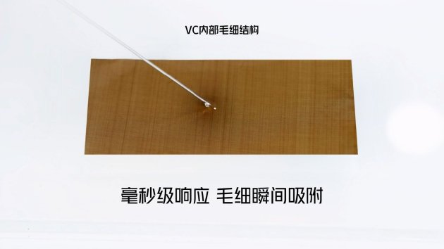 在發佈會上,紅魔也對VC均熱板功能的優勢進行了可視化呈現,演示視頻中水滴滴在VC均熱板之後,被瞬間吸附攤開,這也證明了該VC均熱板的超強導熱效率。