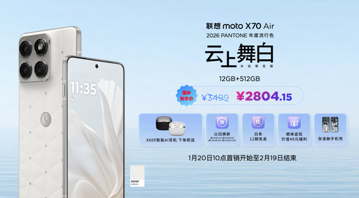 聯想moto X70 Air雲上舞白冰鑽限定版價格為3499元,國補到手價僅約2804元。即日起下單用戶除可享受首銷四重禮遇外,還將獲贈張淩赫同款專屬手機殼,打造從內到外的完整高定體驗。