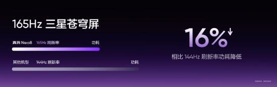 極致性能需要頂級屏幕來呈現。真我Neo8攜手三星顯示全球首發165Hz三星蒼穹屏,採用M14旗艦發光材料,發光能效提升26%,165Hz功耗相比行業144Hz降低16%。