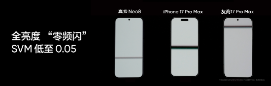 在亮度方面,真我Neo8實現手動最高1000nit、全局峰值1800nit、局部峰值6500nit以及陽光顯示3800nit的全場景頂級通透體驗,陽光顯示狀態下103% P3超廣色域讓色彩還原更準確,高亮不再慘白。新發光材料更帶來了更耐久的發光壽命,真我Neo8採用更嚴苛的T95亮度衰減指標,實測成績長達1500小時,屏幕壽命較行業提升50%。護眼方面支持全新綠野護眼方案,支持全亮度DC調光,SVM低至0.05,並獲得了萊茵無頻閃認證,硬件級低藍光與AI護眼功能,全場景守護用眼健康,讓久玩更護眼。